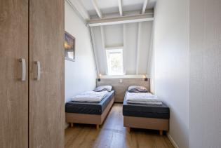 Slaapkamer voorzien van twee boxspringbedden, openslaand raam (HR++ glas) en een kledingkast.