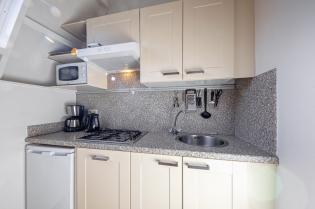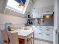 Open keuken (vernieuwd in 2024) voorzien van keramische kookplaat, afzuigkap, magnetron en koelkast met vriesvak.