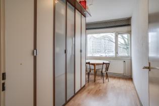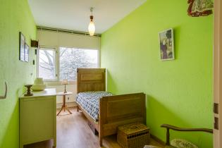 Slaapkamer 2 met laminaatvloer, houten kozijnen, dubbele beglazing;