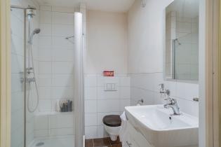 Badkamer deels betegeld met douche (met cabine), toilet en vaste wastafel;