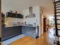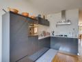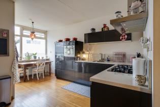 Open keuken met gaskookplaat, afzuigkap, koelkast, vaatwasser en combi magnetron;
